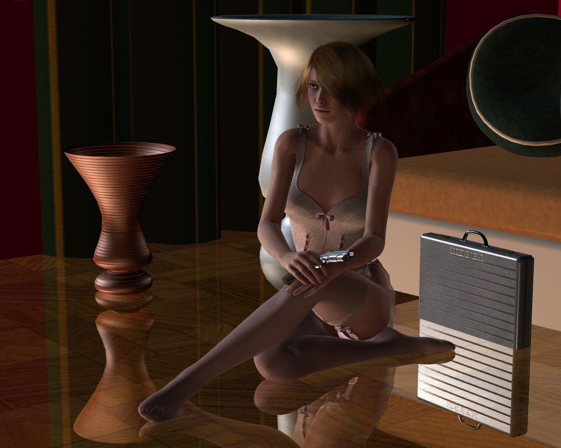諜報部員のV4子さんは、久しぶりの休日を満喫していたのですが、そこに敵側の同業者?刺客?がみたいな感じをポザってみました。これみよがしにあるアタッシュケースは残念ながら、Colt45ガバメントのケースでした。